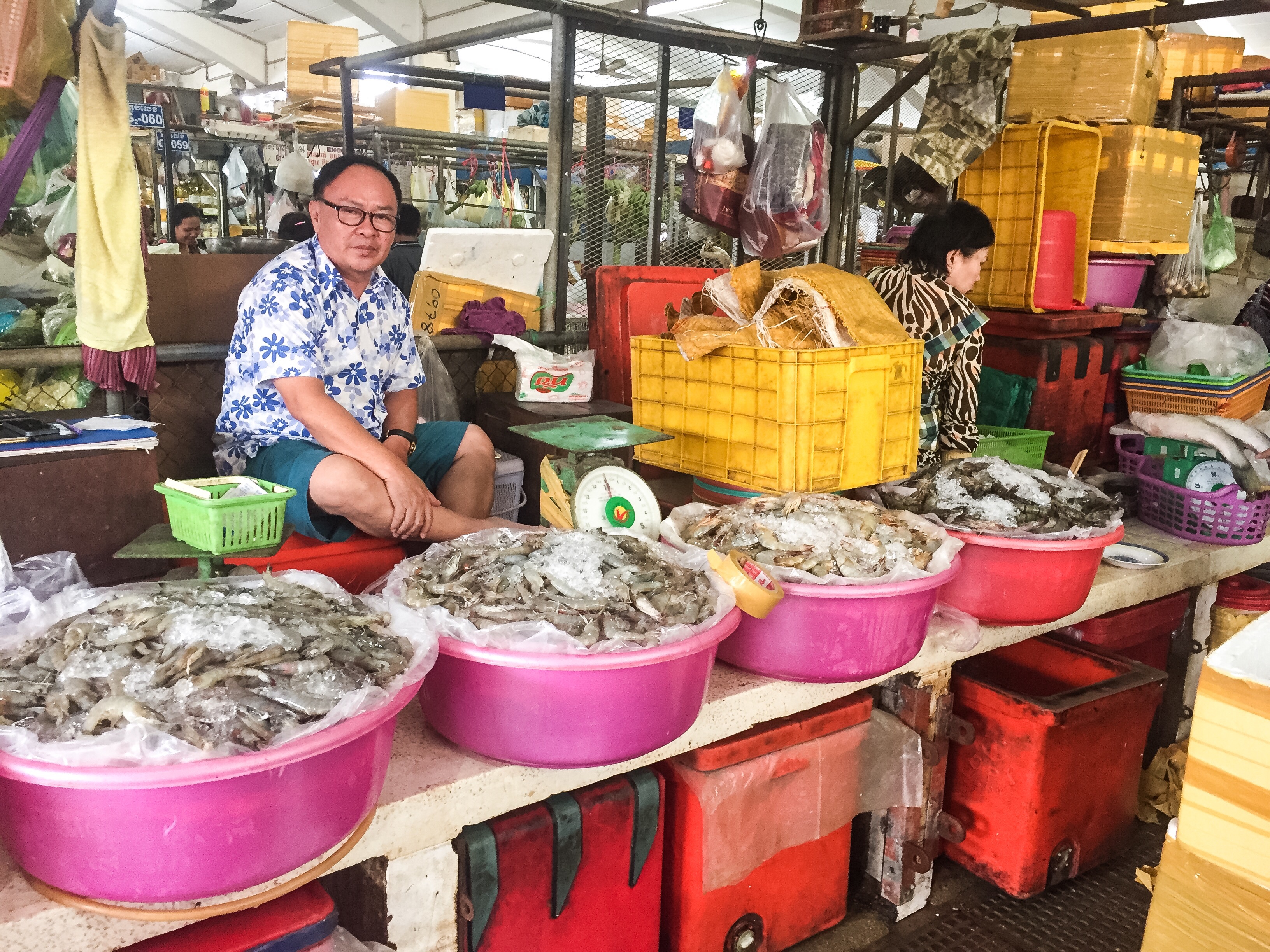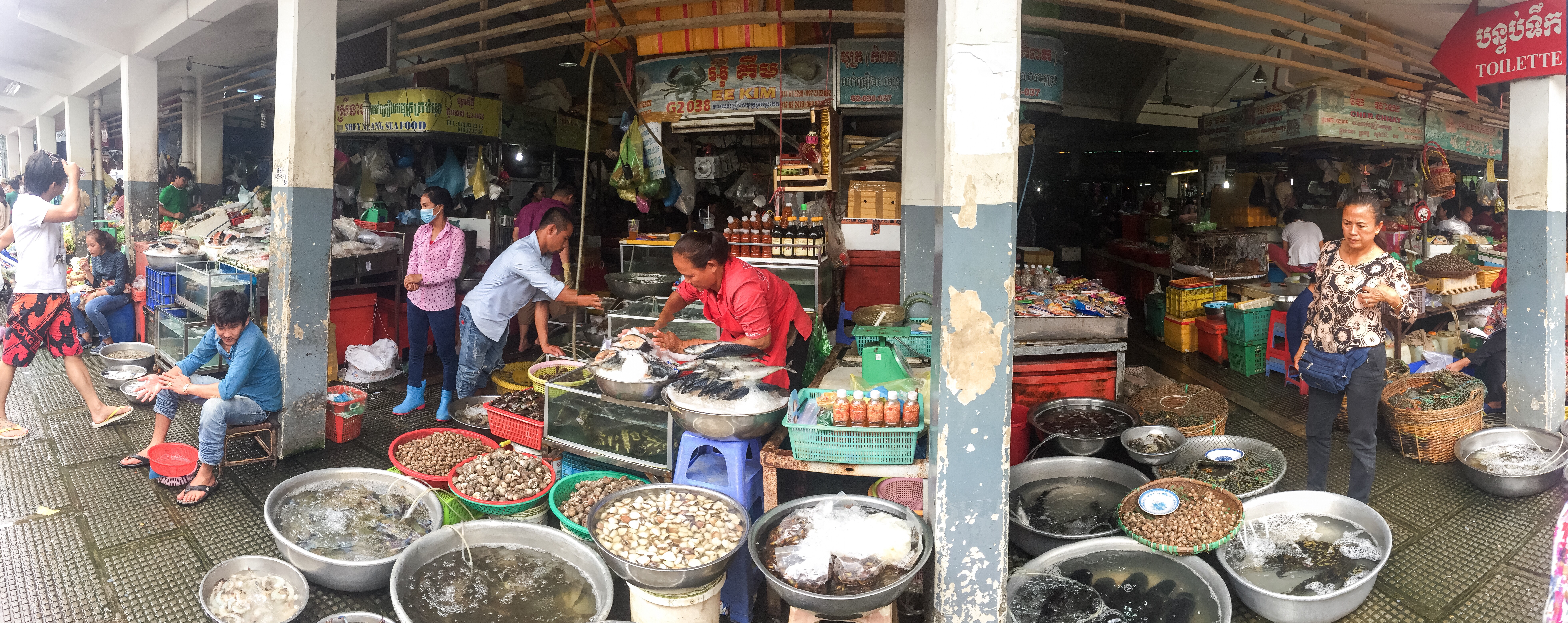 On the way back we stopped at the central market and holy shit was that overwhelming. For a guy that’s not too keen on shopping in the first place, I was the one pushing to go there. I’m not sure what I was expecting but that wasn’t it. So so so many colors, sounds, smells and people trying to sell anything you could imagine. It was like three Walmarts if all the rednecks were Cambodian, all the aisles were 18 inches apart and the majority of it smelled like fish. I don’t think I have the words to describe this place and the insane amount of organized chaos throughout. Jewelers were inside the main building in the center and then it fanned out exponentially from there. Clothes stands were everywhere, electronics, household items and food had their own sections. When I say food, I’m talking about raw (often alive) meat, fruits, veggies, fish and crabs.
