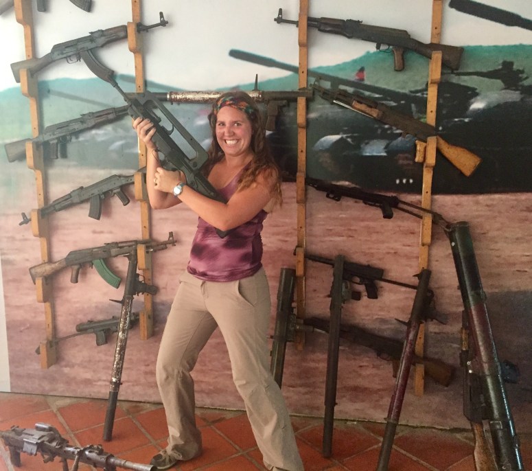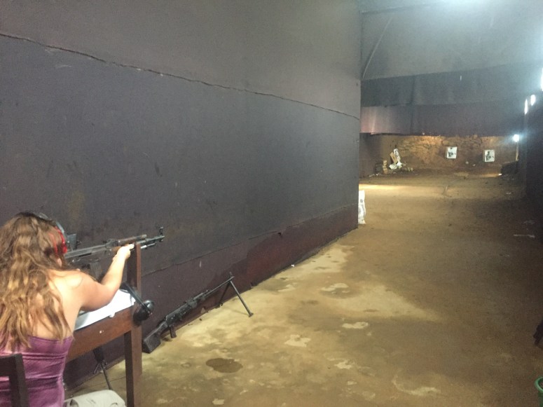 Tang took us way out past the airport so we could get McKayla’s hands on some high-powered weaponry. There are a few places that offer the chance to shoot pistols, rifles, automatic weapons, you could even pay to throw a hand grenade or… wait for it… shoot a rocket launcher. So we pull up to this place and a guy brings us inside and sits us down at a table. He then brings us a menu. On each page of the menu is a picture of a different weapon and the cost in US dollars of how much a clip costs, or in some cases how much it is to throw or launch a grenade. I know you’re wondering what the cost is to shoot a rocket launcher and blow up a small makeshift shed. It’s $400. McKayla settled on the AK-47. She had 25 shots for $50 to show the coconut and a target what she was made of. She even fired its trademarked three round burst. After McKayla took her revenge on a fallen coconut, she got a brief Rambo photo shoot and checked one more thing off her bucket list.
