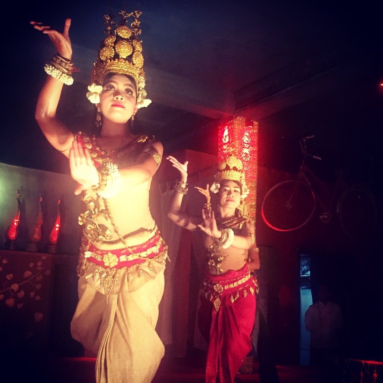 Since we arrived in Cambodia, McKayla’s been keeping an eye out for Apsara dances, a traditional Khmer dance group. She found one performing tonight at the Temple bar for free. After a very questionable lunch (questionable as in we weren’t sure exactly what we were eating) we had dinner at the Temple Bar where we knew what we were eating… but it still wasn’t very good. The mushrooms here are huge and have a very slimy texture, I just couldn’t do it. McKayla had some shrimp in a thick, garlic tomato soup that was pretty good and she was even kind enough to share. As we were eating, the Apsara dancers started coming out. They all had bright outfits with gold crowns resembling temples. Their movements were slow but deliberate. Thier trademark are the fingers that bend backwards, they bend from years of binding(not sure why they put themselves through all that but maybe some king had a weird kink way back when. I’m sure the answer is out there but I don’t feel like researching it; you have the Internet knock your self out if it’s eating at you).