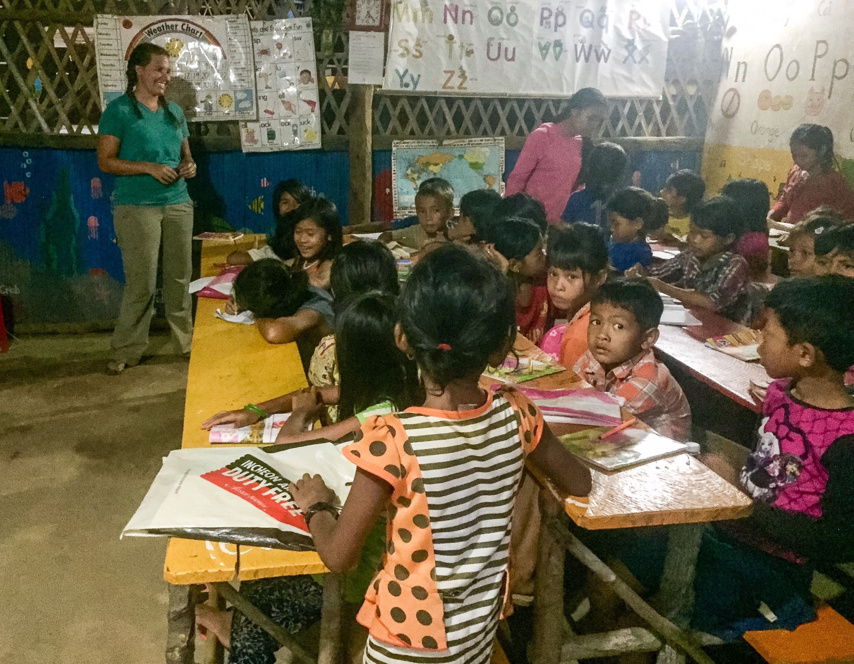 At 5:00 p.m. class starts. It’s free and optional but the kids come full of energy and enthusiasm. The first night I was a teacher’s aid for an hour before it started raining, the roof leaked and class was dismissed. Our second night, Tom said the teacher’s mom was sick and asked if we could fill in. We said we’d give it a shot despite the fact that neither of us have teaching experience (except ski lessons — WHOLE different ball game). But it’s a class to learn English so Tom pointed out that having them listen to us was a lesson in itself.