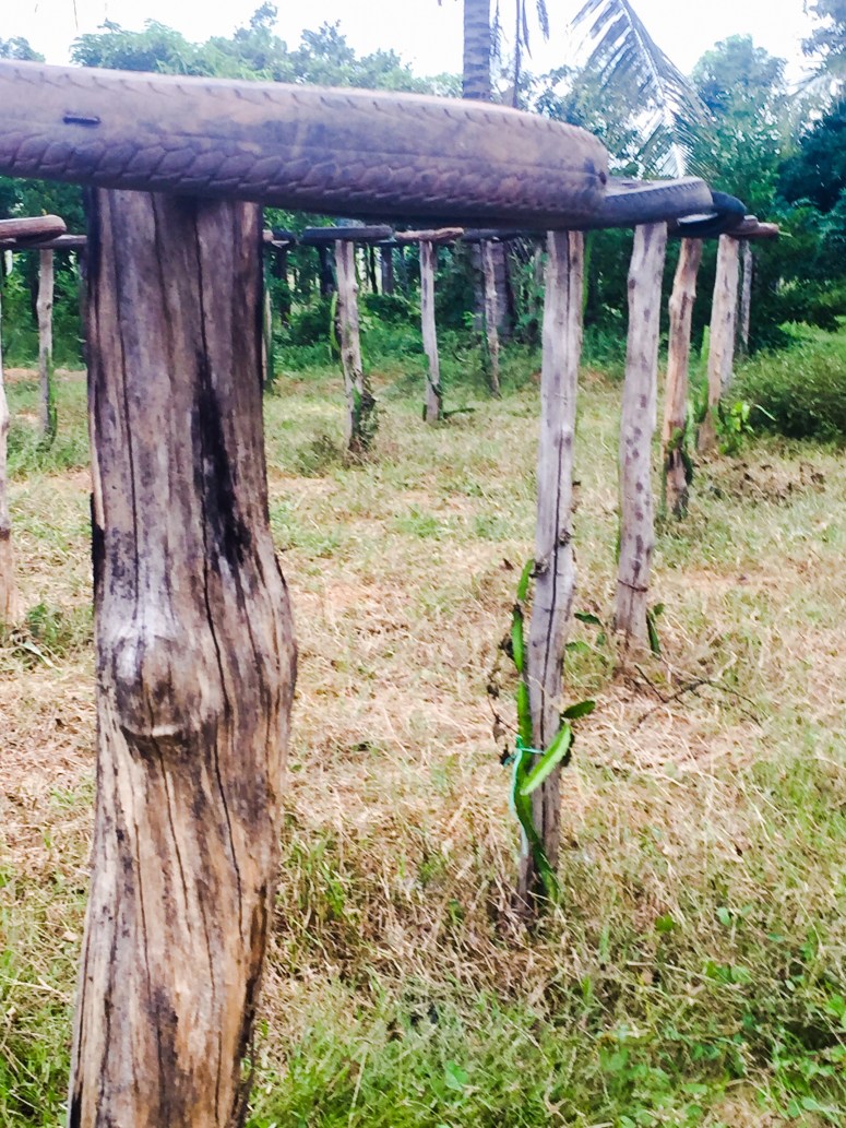 The dragon fruit is a pretty fascinating plant. They are a narrow cactus that climb and spread. Each here is set up with a post topped by a tire. The idea is that the cactus climb as they grow. They actually spread out roots from the leader to grasp onto the post and gather moisture from the wood. Several have grown above the post, through the tire and droop over. Once they get enough drooping over, they produce fruits and look somewhat like a tree. We even noticed a couple that had become detached from their connection to the ground but were still thriving while gripping onto the post. We’re told that most of these were planted 7 months ago, so even the most progressive of these will take another year to produce fruit. But still only, a month and a half? My inner tree nerd is just baffled by these crazy desert jungle trees.