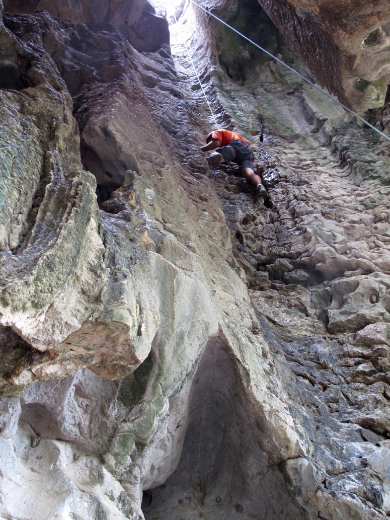 First we did an easy rock scramble to get comfortable and up to the ridge. Then we clipped into the via Ferrata (a metal cable that was anchored into the mountain and gave us something to lock into as we traversed over to a cave opening). I had never used that system of climbing but it felt very safe. There were two safety lines you’d clip and unclip one at a time so you were alway hooked in.