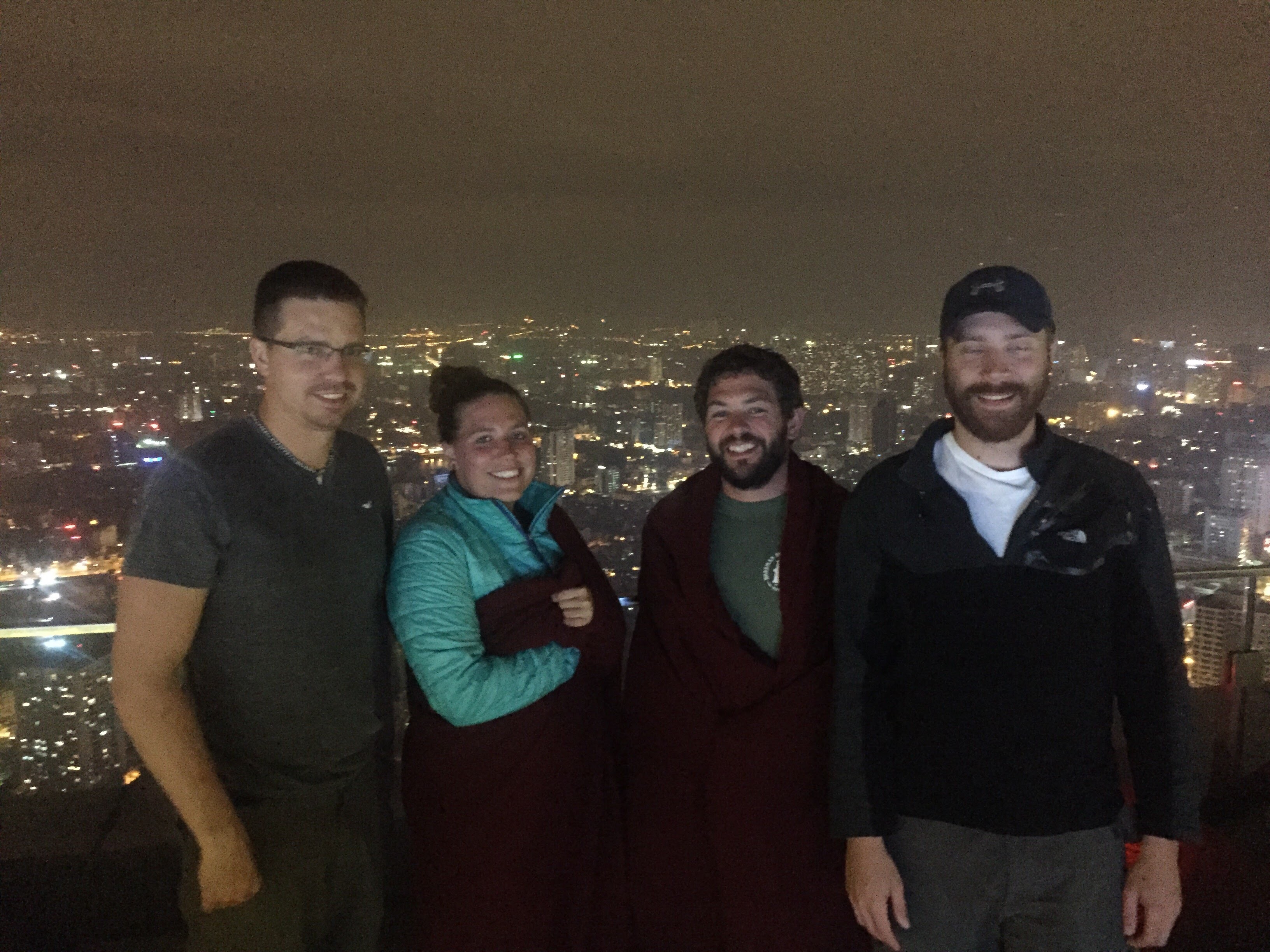 As tired as we were, it was the guys’ last night so we needed to do something special. McKayla did her research and found us the tallest sky bar in Hanoi. The taxi took us from the old district to what may as well have been a different world. The Lotte Hotel was schnazzy – automatic rotating front door and all. 65 stories up to the rooftop and we were in another atmosphere. You could see miles in every directions. Our photos look photoshopped but it was only because we were so much higher than any nearby structure. It was so high up they had heaters out and blankets ready.