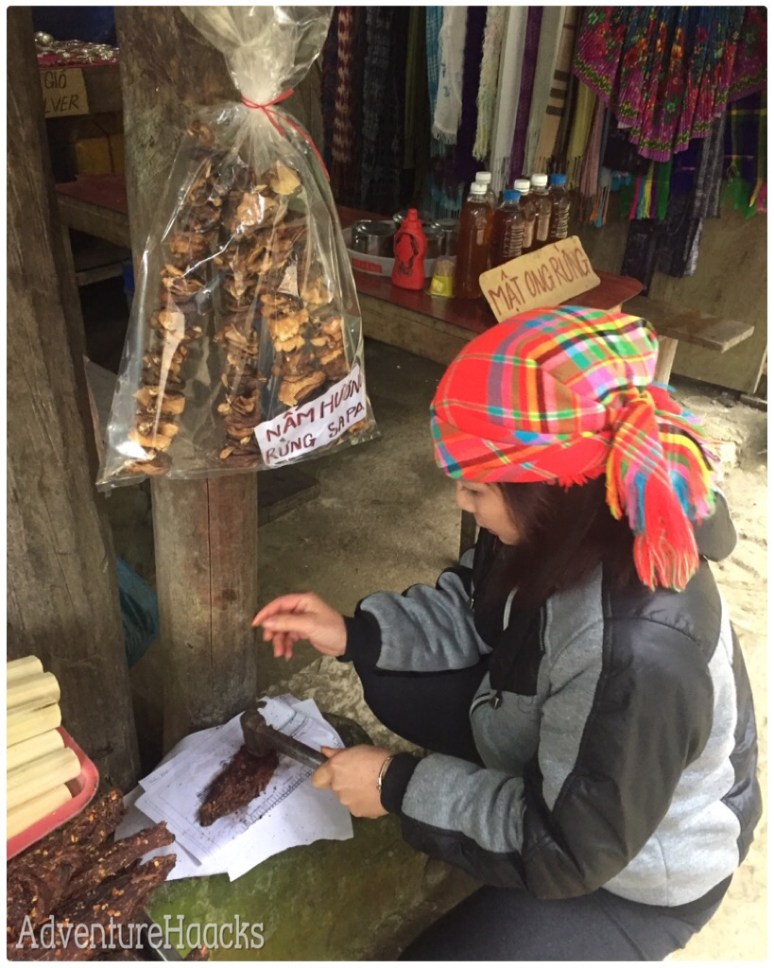 McKayla bartered her way into a nice little necklace. By barter I mean that she walked away slowly while the girl shouted lower and lower numbers until it would have been silly not to buy. McKayla also discovered the local headbands. While the hilltribes are clearly masters of sewing, we have no need or space for blankets or huge scarves… but headbands… headbands could be bought in bulk, tucked away and be nice reminders of these aggressive little mountain women for years to come. Though we only found one at Cat Cat, we now had a mission to find more. Also while in the village, we sampled some of the Sapa street food which included grilled corn, eggs and sweet potatoes, as well as buffalo jerky. The grilled sweet potato tasted like a potato straight off the grill; I shared with a local dog. The jerky was pretty good, she warmed it up on the grill then took a hammer to it, literally, to tenderize it a bit. The result was warm, peppered jerky – a little chewy but tasty.