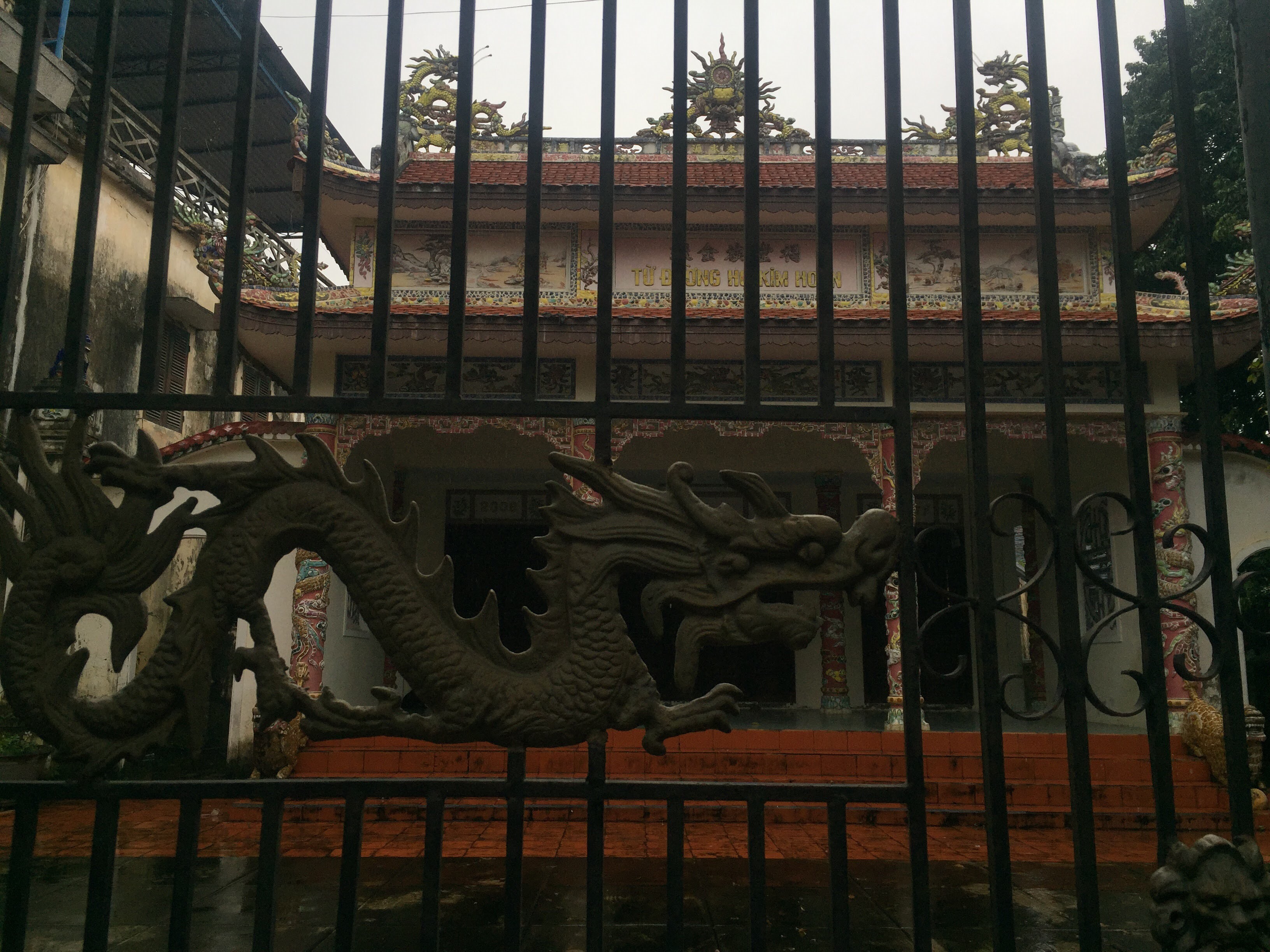 It was raining when we got to Hue but we were determined to get a walk in. The river market was in full swing, rain or shine. As far as markets go, this one was extra crowded and extra smelly. After unsuccessfully bartering for pistachios, we crossed a canal and went searching for a couple wats that were marked on our hotel map (one of several nice features of the Jade Hotel in Hue). For whatever reason, this area of town had their sidewalks laid in smooth red tile. These little red bastards were the slickest surface imaginable. Most had an algae-like film on them and once wet, it was like watching a Three Stooges show – whooop, whooooop, whooooop. Anyhow, we found the wats. One was set in the back of a big courtyard and had some warrior statues. The other was closed off but described how they’ve been training gold smiths for a thousand years; the dragons curling on top of the roof were laiden with gold and purple in their fierce pose.