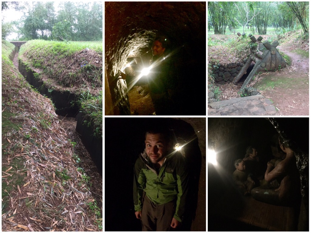 There was a bus going from Phong Nha to Hue that also served as a tour. On our way to Hue we had two stops. One was to some of the tunnels dug during the war and a stop at the 17th parallel/DMZ. The tunnel systems were very impressive with several entrances, multiple layers 12 to 80 feet deep all surrounded by once camouflaged trenches that were 8 feet deep. This was only one of several thousand tunnel systems. I’m assuming they chose this one as an attraction because it was one of the best constructed and most ‘luxurious’ of the systems. That being said, this place was cramped. Their rooms were about 8 ft long X 4 ft wide X 4 ft tall and that space was for a family of 4. Throughout the war it held 600 people! For 4 years, 600 people squished down there with one toilet whenever there was a bomb raid. They came out at night when they couldn’t be seen but I could only imaginee what a tunnel filled with 600 people would smell like. They had vents but no amount of ventilation could clear that. We were in there for 20 minutes tops and the 3 Russians with us on our tour were enough to give us an idea of how bad it could get. Neither of us is claustrophobic but 20 minutes of crouching through those tunnels was enough. A true feat of engineering for humans doing what they needed to in order to survive.
