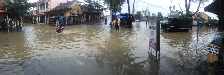 The next 3 and a half days are a washy blur of rain and rising flood waters. The same bridge we crossed the first night in Hoi An was now gone when we went downtown. We’d seen historic flood marks in old houses along the river but hadn’t expected to experience it. The night market across the river where McKayla bough earrings the night before was now a different kind of tourist attraction: “Boat? Boat? You want boat?” was the new promotion. Clearly this town had known floods. Everyone was treating it as more of an inconvenience rather than a threat but there were still 4blocks west of the river and 2 blocks east of the river that were now under at least a foot of water and had their electricity out.