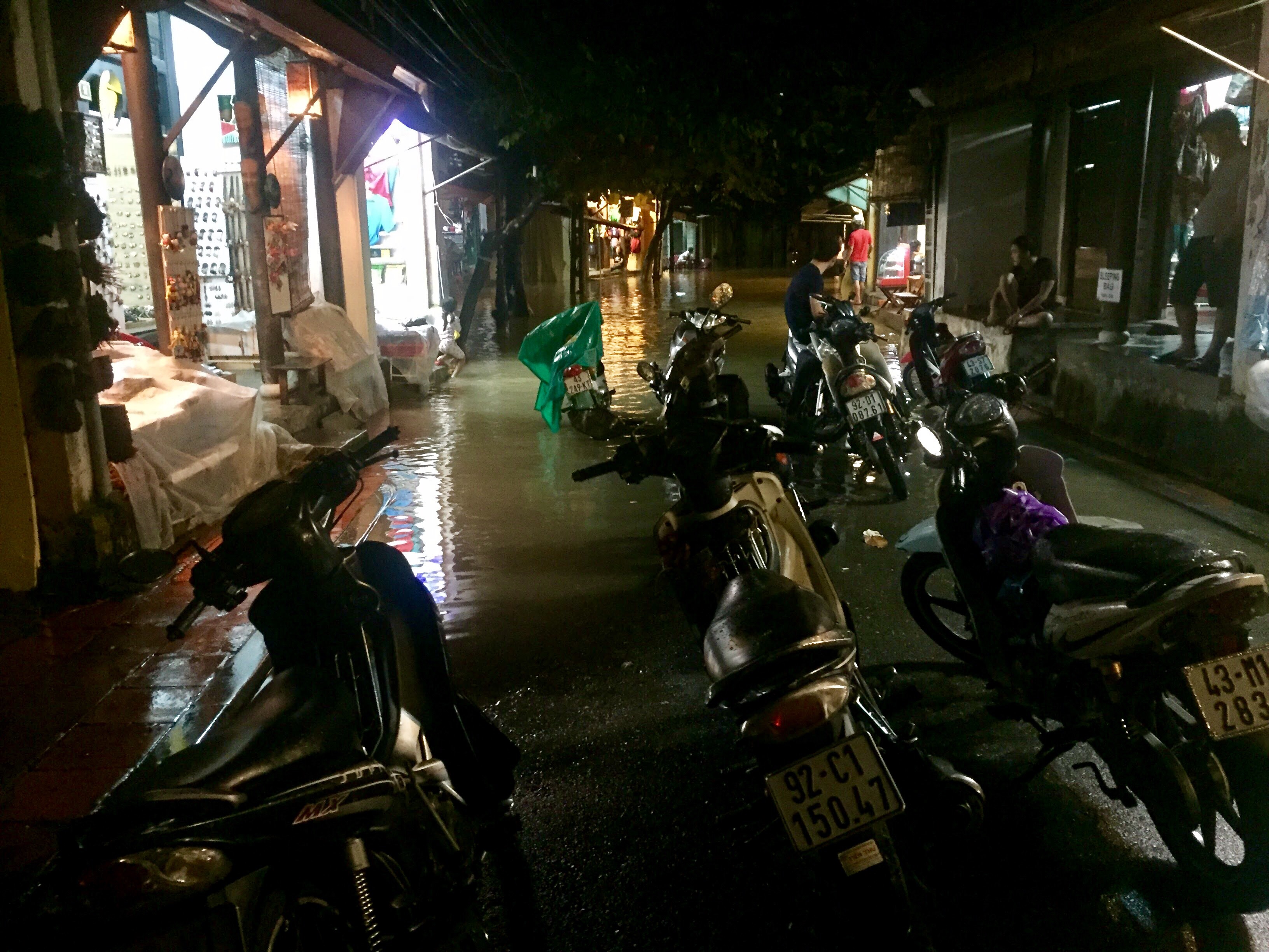 The next 3 and a half days are a washy blur of rain and rising flood waters. The same bridge we crossed the first night in Hoi An was now gone when we went downtown. We’d seen historic flood marks in old houses along the river but hadn’t expected to experience it. The night market across the river where McKayla bough earrings the night before was now a different kind of tourist attraction: “Boat? Boat? You want boat?” was the new promotion. Clearly this town had known floods. Everyone was treating it as more of an inconvenience rather than a threat but there were still 4blocks west of the river and 2 blocks east of the river that were now under at least a foot of water and had their electricity out.