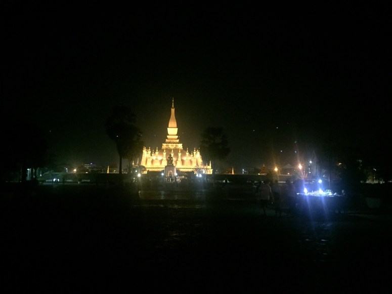 The last thing we saw in Vientiane was the Great Golden Stupa. It was a pretty long walk to get there but we stopped and shared a smoothie halfway. Just before we got to the stupa, we crossed a big parking lot filled with people – some were doing a dance workout routine, some were playing soccer, some just walking laps. It was roped off to cars and was the size of a small runway. The grassy park across the street was empty. Not sure why they preferred the asfalt but it was good to see so many people outside, enjoying the night.