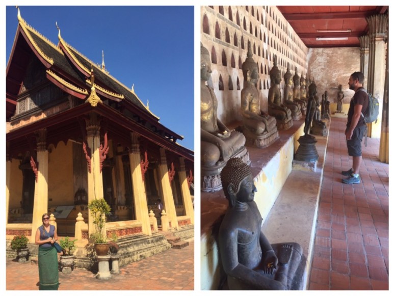 Our next stop was at the Wat Si Saket, a Buddhist temple. Like many religious areas in Southeast Asia, they had a dress code – pants or dress that goes below the knees and shoulders must be covered. My dress went just to my knees, but not below. I thought I’d have to sit this one out but luckily the lady at the ticket counter pointed to a basket of rental skirts. I could tie one around my waist and go inside. Genius! I don’t think that was an option at the religious places in Cambodia and Vietnam but they should consider adopting it. I happily threw on the rental skirt and went in. The walls were lined with stone Buddhas and the inside of the wat had some beautiful wall paintings. It was a sight I was glad I didn’t miss.