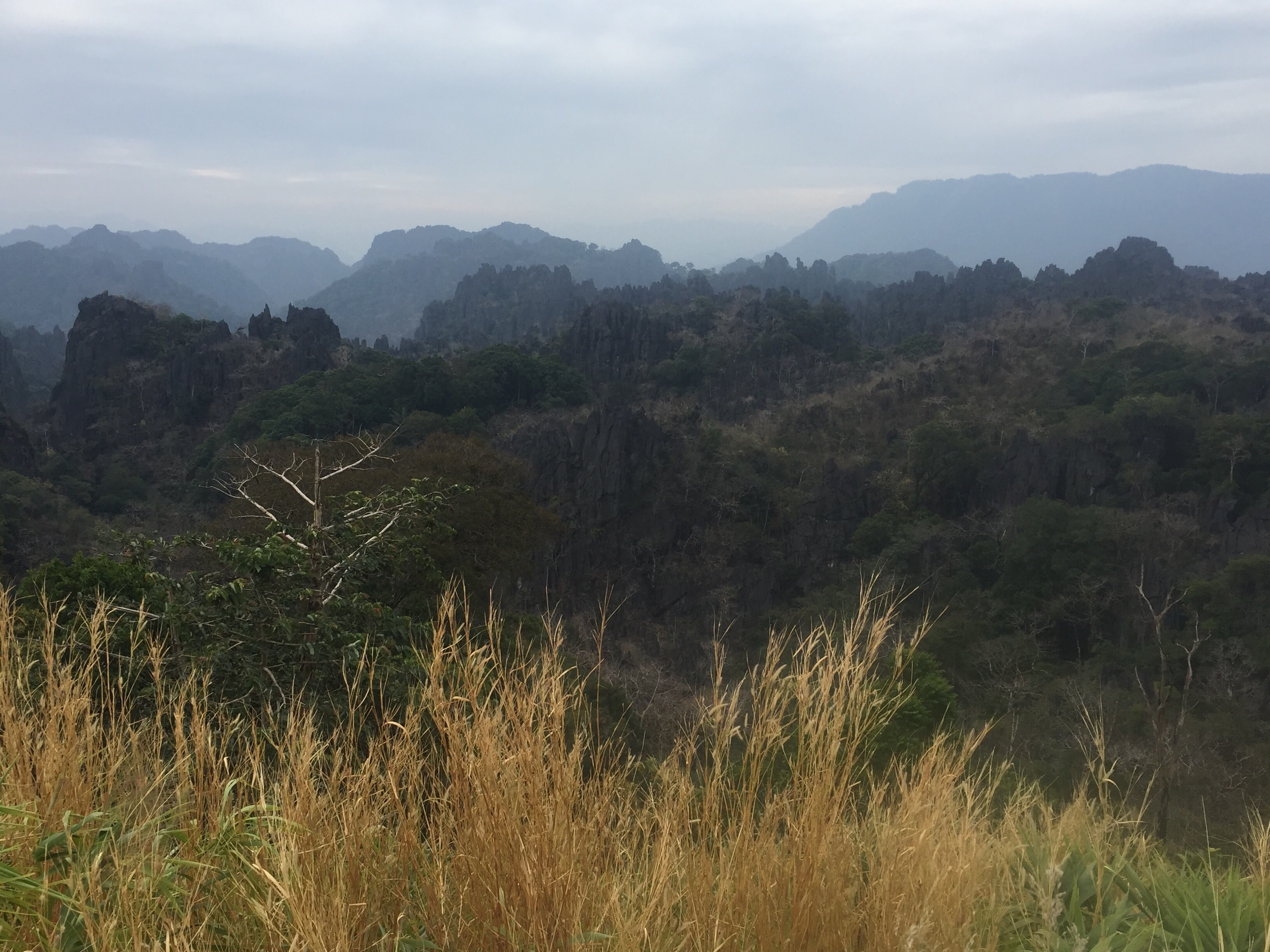 The rest of the ride on day 2 continued to impress. Valley floors had become dry and distant mountains became our new roadway. Again, the drive was filled with climbs and falls and endless fun, curving roads. On the uphills you had to down shift and blast full throttle around nearly blind corners after having to slow down to check for traffic. On the downhills, the views mixed with the adrenaline of dodging occationally really deep pot holes gave us both a pretty wild high. There was a nice pavillion set up on one of the passes with a great overview of the valley we’d be riding through on day 3. Robert and Mikell had told us the name of a guesthouse that was about 40 km from the main attraction on the loop, the Kong Lor Cave. Just before we reached the guesthouse, we stopped at a waterfall. It was almost dark but the sign claimed it was only 300 meters in from the road so we stopped. We had to drive almost a mile into the park on a narrow dirt path in order to climb a mile and a half up a rocky hillside so they can shove their 300 meters up their ass. The twin falls were down to a light trickle but I suppose they were worth the effort of a nearly nighttime jungle trek.