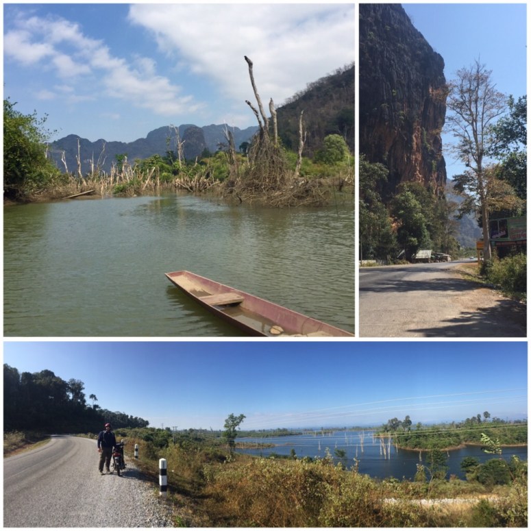 The first road out of Thakhek heading east was fairly wide, it was used as a border crossing route between Vietnam and Laos so we occasionally had to “share” the road with some pretty big and erratic trucks. After the road forked, we continued northeast, the traffic settled and the road narrowed a bit. It really started to get interesting after we crossed over a dam. The road began to climb, steep and sharp curves with jungle cliffs on our right and increasingly better valley views to our left. Eventually, we came to a small town resting on the rim of what was clearly now a very steep valley. Our view from the top didn’t last long as we were thrust back into a dense jungle-canopied descent that snaked its way back down to the valley floor. We stayed down awhile weaving our way through a strange mix of marshland/high mountain valley that’d been flooded since the addition of the dam. The dead standing trees jutting out of the lake was a clear and almost comforting indicator that this was not this place’s natural look; otherwise this much water through a mountain jungle would’ve been more concerning.