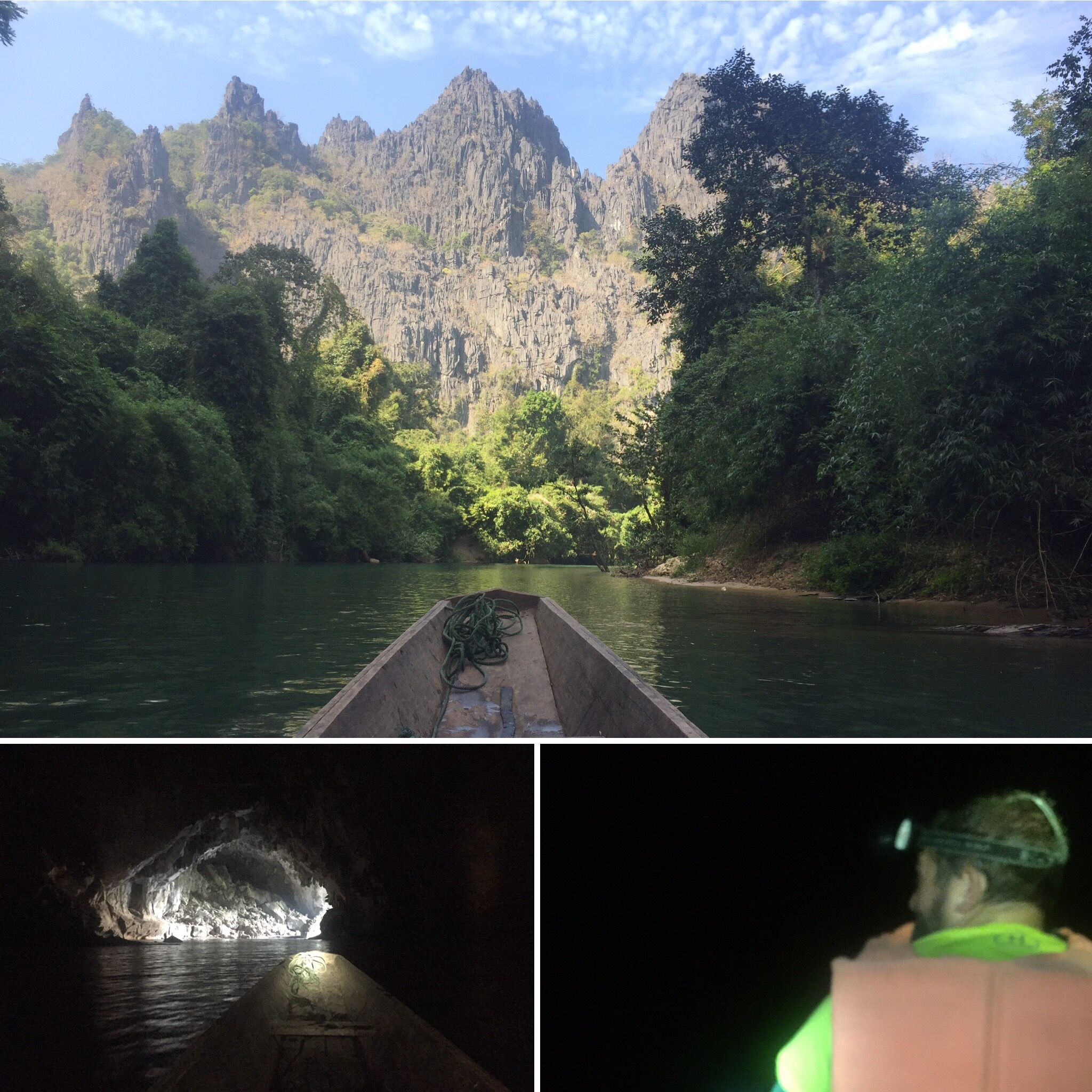 Our beautiful valley ride on this nice clear day continued, slowly, until we reached the cave/end of the road. By this point in our trip, we’d seen lit caves and dark caves, small caves and big caves, we’ve accessed caves by walking,climbing, kayaking, tubing, swimming, paddle boat and rappelling. Now it was time to tour a cave via speedboat. That’s right, how else would you want to access a completely unlit corridor of shallow water? There are rides at Orlando that are less thrilling then this tour, then again… the likelyhood for injury or death also seemed higher. Our captain had a 3 ft wide boat (I just measured that by imagining how far apart my hands were while I was holding on for dear life) with a little engine sporting about an 8 ft prop with a little propeller. Our captain’s floodlight of a headlamp was on a swivel, never ceasing its side to side sweeping as we flew through this cave. We stopped for a short walk to check out some columns and stalactites then it was back in the boat. We exited the far side of the cave into a stream surrounded by staggering peaks. The boat stopped long enough for a restroom break and a cup-o-noodles. Then, we got to do the ride again, another 40 minutes and we were back to the other side.