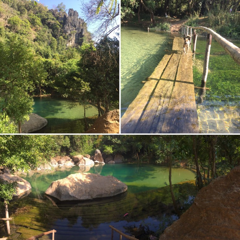 After our errands were taken care of, we took a short dirt road to the cold springs. This road was in an open stretch of prairie and a few times I almost lost control of my bike in the wind but we hunkered down and pushed on towards the huge, jutting mountain wall in front of us. at the base of those mountains sat the cold springs. First things first, McKayla needed to warm up her hands again. This time with a hot cup-o-noodles. Though several of our tourist community had stopped, we were clearly some of the only Americans the local workers had ever seen. Their gasps and tisks quickly turned to curiosity as they blatantly stared at us, some from just a few feet away. I had to suppress the voice in my head from asking “can I help you?” For whatever reason that voice was said in Eddie Murphy’s voice, but instead of going all Beverly Hills Cop, I went for a swim. It was kind of cold but the clear blue water surrounded by boulders was a little too inviting. I did my best to bolster Lao/American relations by diving for trash in a fairly deep spot of the springs. Not sure if anybody noticed but it was a good swim just the same. Meanwhile, McKayla continued to be gawked at but they were nice enough to bring over a bench where they could stare at her while sitting instead of standing.