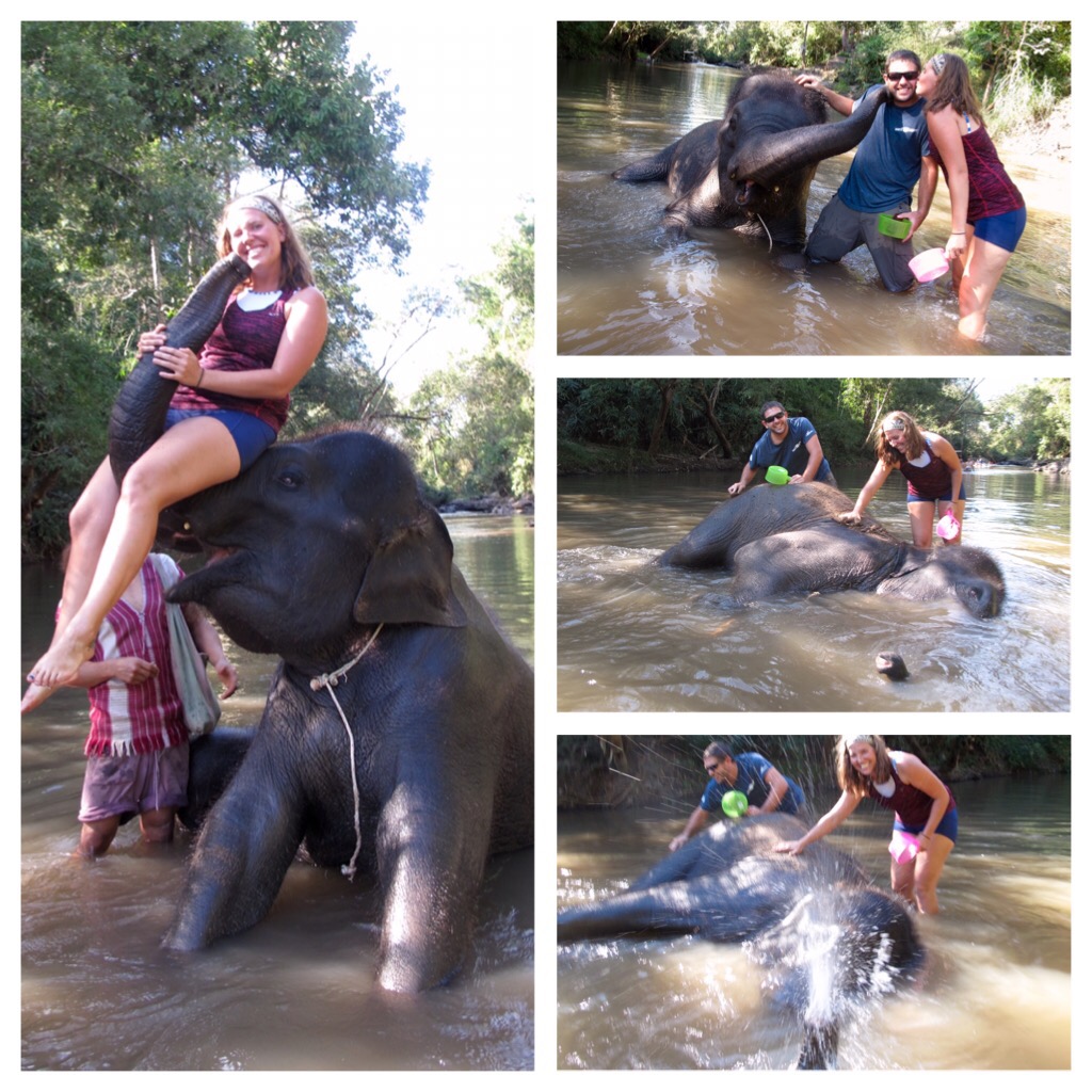Though Deedee was only 7, she seemed to be the smartest, or at least the most outgoing of the troop. Her handler got her down to the river where she happily flopped into the water, rolled onto one side and awaited her scrub down. She laid sideways with her face fully submerged, only slightly exposing her trunk which she occasionally made into a fountain while we scrubbed her with sand and brushes. It was like petting an enormous dog, she loved being scratched behind the ear and I even got her leg kicking once while scratching her butt. Deedee was pretty happy to be in the water. Her handler said she was a hot elephant, always going for the coldest parts of the river. The mahout asked McKayla if she wanted to take a picture on Deedee’s trunk. She went and stood in front of Deedee and was caught off guard when she lifted her into the air then proceeded to reach up and give her a kiss on the cheek. It was truly a unique and incredible experience.