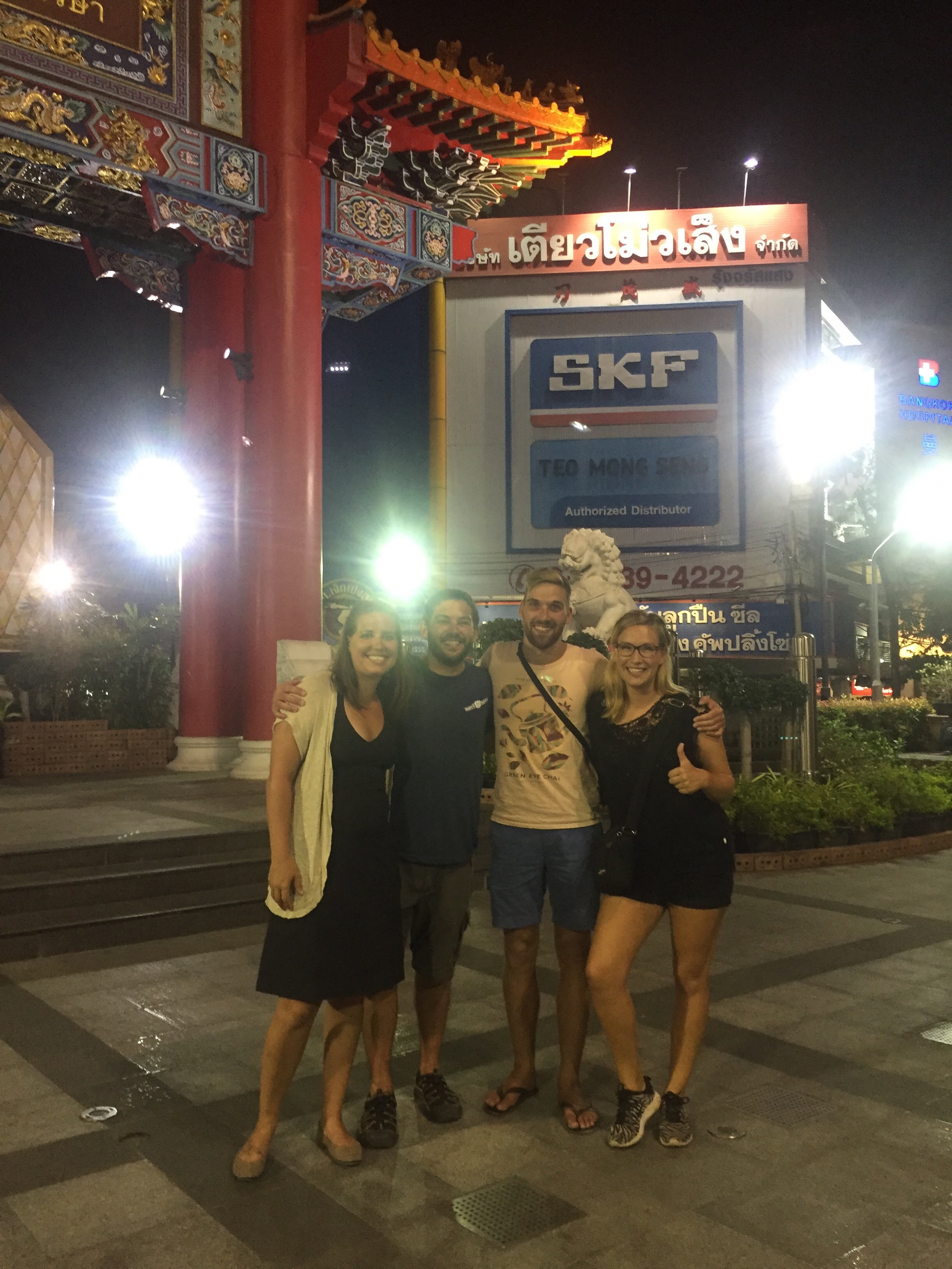 Our first night we met up with some friends we’d met in DaLat, Vietnam. Jerome and Charlotte are a really nice couple from the Netherlands and Belgium, respectively. They were only 2 days behind us on the Thakhek Loop, in Laos, and our paths have been close a few other times but we all happened to arrive in Bangkok on the 26th. We had a fun night finding some really good street food – although it nearly killed Jerome from spice, he actually started turning purple. It was a great night of swapping both horror and success stories in our travels throughout Southeast Asia, while weaving our way through shady back alleys on our way to Chinatown. The Chinese New Year happened to start just as we arrived to Bangkok so the 4 of us went looking for dancing, dragons and fireworks. Sadly, there were no celebrations that night. The first night is more of a family night or so we were told. Through our wandering, we were able to find the China gate, which resulted in more than a few failed pictures and a pretty nice temple. All of us were fairly beat so we grabbed the subway and made our way home. It’s always great to see some familiar faces and you cannot beat these two for positive attitudes; they smile as much as McKayla… okay, almost as much as McKayla.