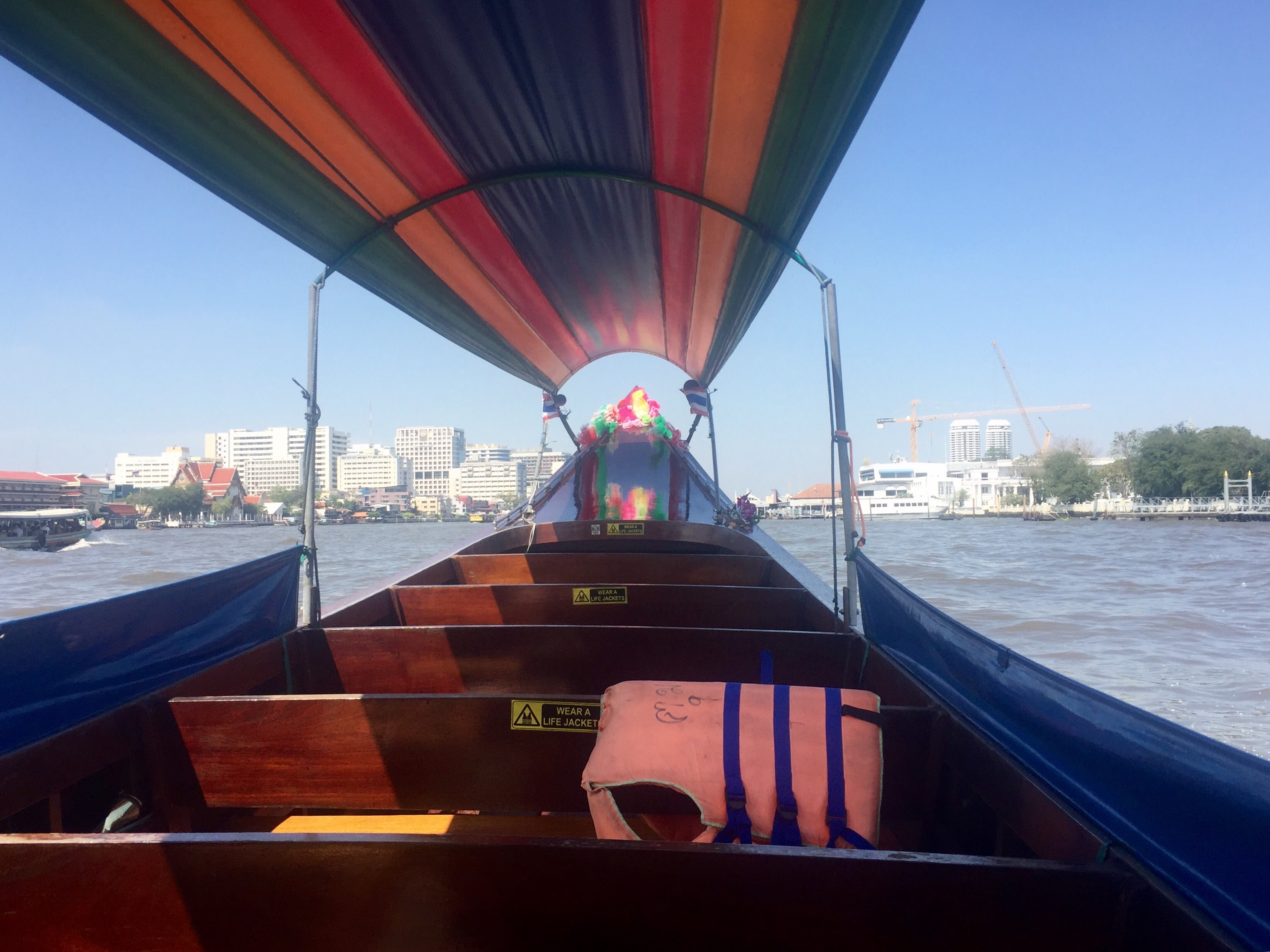 It’s hard to imagine a better start to a day – good sleep, nice breakfast, short train ride… ferry taxi! Are you sick of all the hustle and bustle? Long commutes? Endless stop and go? Bridges? Terrifying tuk-tuks? Well the ferry taxi is right for you. We showed up at the Sathorn Pier, bought 2 tickets to Tha Chang, the stop near the palace, then were ushered onto the dock by a surprisingly intimidating 12-year-old that I wouldn’t want to fight (not sure those tattoos were fake) and watched the boat come in. Most boats were the ‘long boats’, about 8 feet wide by 40 feet long and took. People either on tours or to different docks lined up and down the river. It was really a sight to see, the organization and timing of these guys was impressive. We didn’t wait 10 minutes before they had enough passengers going in the right direction to send us up river. Most boats had colorfully decorated covered and flowers hanging from the bow. The river was a great way to see the city and an eye-opening experience to see that kind of transportation with such precision in such a chaotic city. It may have seemed very calm and precise given the lack of motos and whizzing tuk-tuks in transport, certainly smoother than we’d been used to despite the wake given off by other boats.