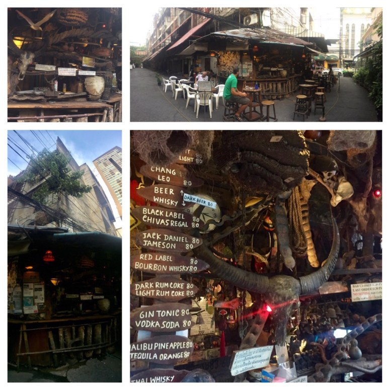 We did some more research and had a better idea of where Cheap Charlie’s was located. Though we’d scoured the back alleys of Soi 11 we were confident we could find it in the day time. At least we had good reason for not finding it last night – turns out it was a bar made of scrap wood barely hanging onto the outside of a building and they closed at 11:30 pm by draping a tarp over it. So today Cheap Charlie’s was ‘discovered’ and true to its name, it offered pretty cheap drinks. The bar looked like 3 kids had tried to build a fort, gave up, grew up and started selling liquor. The seating was made up of a dozen small tables with stools sitting in an alley. The bar itself was decorated in an array of skulls, bird nests and wood carvings.