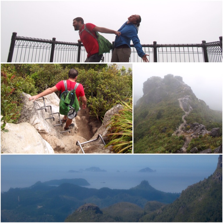 At 9.5 miles with a constant and steady climb, the Pinnacles wouldn’t be the easiest one for us to warm up with, but hey, you got to start somewhere. The day began with a constant drizzle occasionally kicking up to a heavy drizzle. The weather wasn’t playing ball but we were determined just the same. The path had been set up by loggers nearly a hundred years ago to get after the valuable kauri trees, but to this day not many trees have returned. The trail was set up with about 3.5 miles of stairs. Stairs carved out of rock, leading to stairs of wood and gravel, then on to medal ladders, followed by medal bars imbedded into rocks leading to the summit. Everyone coming down the trail from the hut on the ridge was soaked. Getting closer to the summit, we found fellow day-hikers that’d come down, shaking their heads, reporting: “cant see a thing”. By the time we reached the top the clouds still hadn’t lifted and the wind was ripping. Though the clouds hung heavy, the rain quit and we had a great view of the gulch below. On our descent, the clouds cleared and gave us a marvelous view of the ocean and a handful of rocky islands. Some of the rock walls had the impressive jagged look of my beloved Glacier peaks. A half mile down from the summit, we had nothing but clear skies and stairs to look forward to. For our first hike, it definitely kicked our asses but it turned out to be a really great introduction to New Zealand.