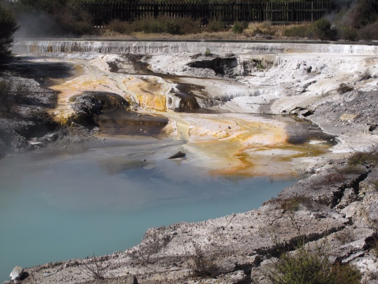 Rotorua was a nice little lake/geothermal town in the heartland of the North Island. It’s one of the most geothermically active places in the world. We woke up fairly early at our crowded campground on the lake and made our way into town. It was important to us to experience some Maori culture and it’s always good to check out some geysers when you can. The Whakarewarewa village killed two birds with one stone. It offered a guided tour through a Maori village that was built on a geothermal park. It was really interesting to see how they used the thermals to their advantage. They used it to heat their houses, had a few different methods of using it to cook (One using the ‘moldy microwave’ to slow steam food in a covered dugout and the other by directly dunking vegetables and shellfish into the boiling springs) and they also had a great set-up for their soaking pools (the hot springs ran down hill into a series of ground level gutters that drained into tubs. If the tubs were too hot, block the gutter and let it cool for a few hours or add cold water from the hose), genius. Not sure how comfortable I’d be living on ever-shifting, extremely hot sand with a potential for eruption… but having a couple geysers in your backyard would be cool as soon as you got used to the smell of sulfur. We were guided through the park/village by a fourth generation guide/many generation villager and she did well to combine the history and science of the thermals with the culture of the tribe. They even had an ancestral performance with traditional garbs, song, dance and it concluded with the Hakka (a sweet war dance/ rugby warm-up aimed at striking fear into your enemies and get you syked for battle… or rugby).