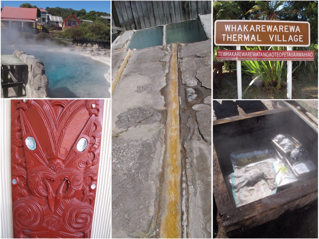 Rotorua was a nice little lake/geothermal town in the heartland of the North Island. It’s one of the most geothermically active places in the world. We woke up fairly early at our crowded campground on the lake and made our way into town. It was important to us to experience some Maori culture and it’s always good to check out some geysers when you can. The Whakarewarewa village killed two birds with one stone. It offered a guided tour through a Maori village that was built on a geothermal park. It was really interesting to see how they used the thermals to their advantage. They used it to heat their houses, had a few different methods of using it to cook (One using the ‘moldy microwave’ to slow steam food in a covered dugout and the other by directly dunking vegetables and shellfish into the boiling springs) and they also had a great set-up for their soaking pools (the hot springs ran down hill into a series of ground level gutters that drained into tubs. If the tubs were too hot, block the gutter and let it cool for a few hours or add cold water from the hose), genius. Not sure how comfortable I’d be living on ever-shifting, extremely hot sand with a potential for eruption… but having a couple geysers in your backyard would be cool as soon as you got used to the smell of sulfur. We were guided through the park/village by a fourth generation guide/many generation villager and she did well to combine the history and science of the thermals with the culture of the tribe. They even had an ancestral performance with traditional garbs, song, dance and it concluded with the Hakka (a sweet war dance/ rugby warm-up aimed at striking fear into your enemies and get you syked for battle… or rugby).