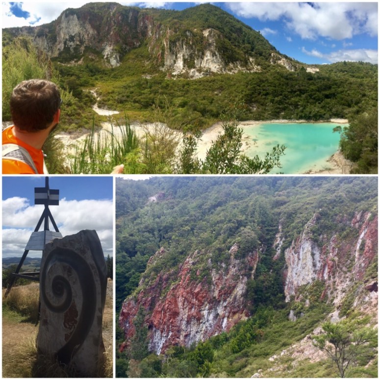 We attempted to go to another thermo park that’d been privatized. Without any Maoris yelling at us and slapping their chests it didn’t seem worth it. Instead we found a nice lake to walk around and enjoy some of the local farmland. The lake walk was followed by a beautiful hike up Rainbow Mountain. By the name alone we had to hike this one for McKayla’s sake. The first lookout was to a bright turquoise pool that looked even more incredible with the back drop of blood red mountains. I’m not sure what mineral made these cliff walls that deep red color, but I’d never seen anything quite like it. Though the rock faces were nearly sheer there was still green vegetation poking out of the red. There were even a few small patches of yellow and orange mixed in near some of the more active parts of the mountain that breathed a consistent small puff of geothermal steam. The summit was crowned with a radio tower, but still offered a great 360* view. Rainbow mountain certainly earned its name and offered a lot of the same geothermal features that the park this morning had offered, just without the price tag.