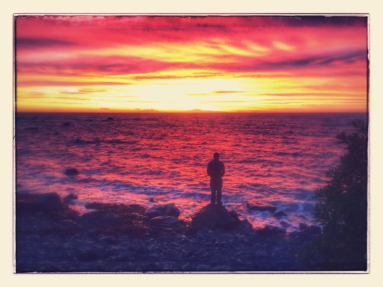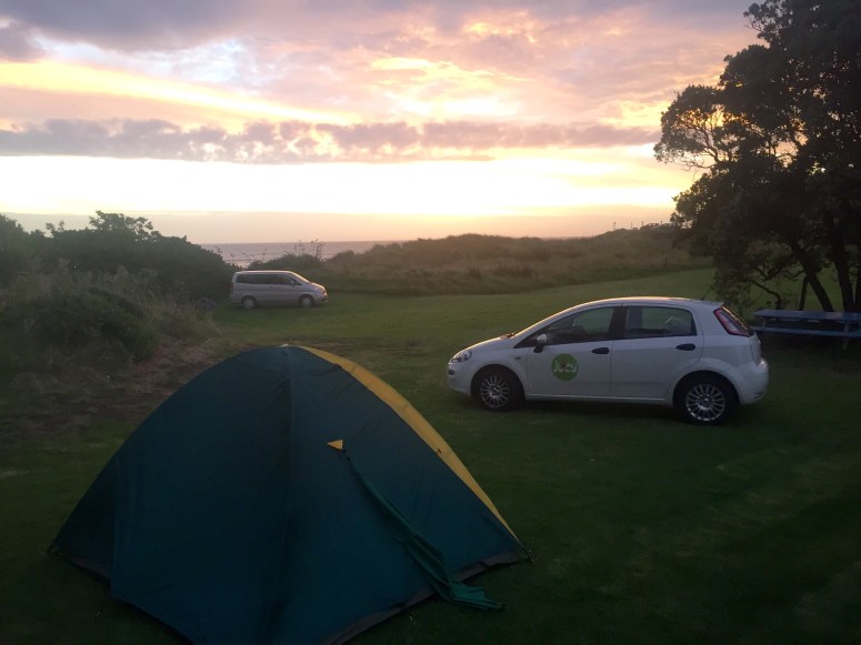 Saturday we had another long drive through the heart of the southern central part of the north island. We only made a brief stop for supplies on our way to Cape Palliser. There was another complimentory campground across from the tiny town of Ngawi right along the ocean. There was even a spot left next to a picnic table, jackpot. The Jucy rental company was supposed to include folding chairs and a table but in our dash to get on the road, they (and I) forgot about them. Instead, we picked up two of the smallest folding chairs imaginable at the used camping store. Any smaller and they could not be classified as chairs. While, they work well with our cooler-table, when possible a picnic table or campground kitchen is definitely preferable. The picnic table kept on giving, more people flocked to this lonely picnic table and we had the chance to share a meal with some new friends, an English guy and a Dutch couple. Soon the five of us were enjoying one of the greatest sunsets I’d ever had the privelidge to take in. Our sunset view was enhanced by the distant view of the South Island mountains. It was just stunning.