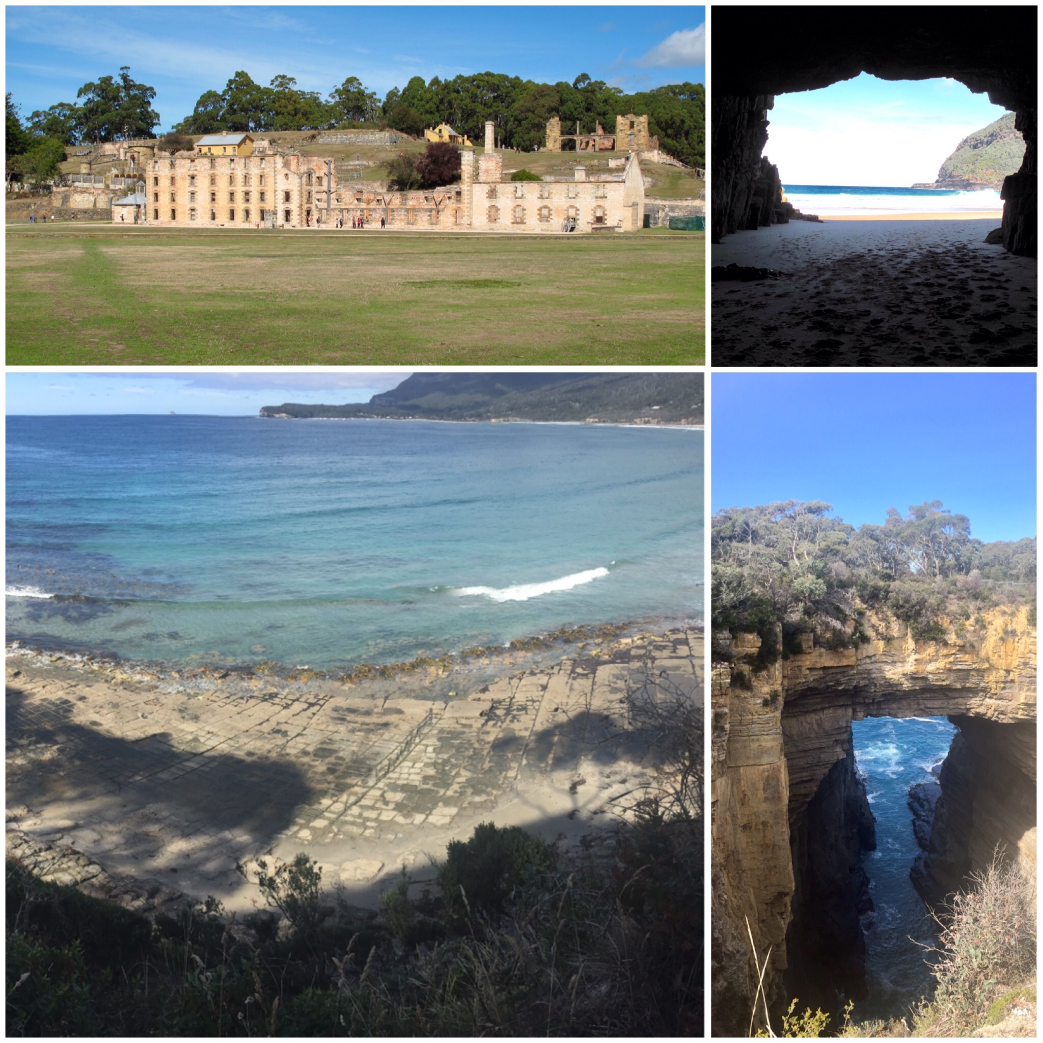From Hobart, it was a short drive to the Port Arthur peninsula. On our way out to the once notorious prison, we stopped to check out some tessellated pavement that looked like man-made square stepping stones that’d been laid into the coastline. In fact, the cobblestone ‘beach’ was a natural occurrence by some process of salt water incursion + erosion + time * y= tessellated rocks. Then we made our way to the Remarkable Cave (actual name), which was made up to 2 cave entrances leading into a single passage. Since it was low tide we were able to hop over the safety railing and make our way into the single passage and out both of the entrances which led to a sandy beach with a view of some heavily crashing waves and the ocean beyond, truly remarkable – zing! Next we stopped at a natural arch that’d been formed by waves eroding the underlying rock, just like those remarkable caves. It was also where you could catch a glance of the Devil’s kitchen. (Between New Zealand and Australia I think we’ve seen most of the Devil’s house. We’ve seen his punch bowl, his staircase, his kitchen, and we’re heading to the Outback where I assume his living room and bedrooms resign. By the end of this trip we’ll have even gotten a look at the Devil’s marbles, if only from a photo, didn’t need an upclose shot of that one.)