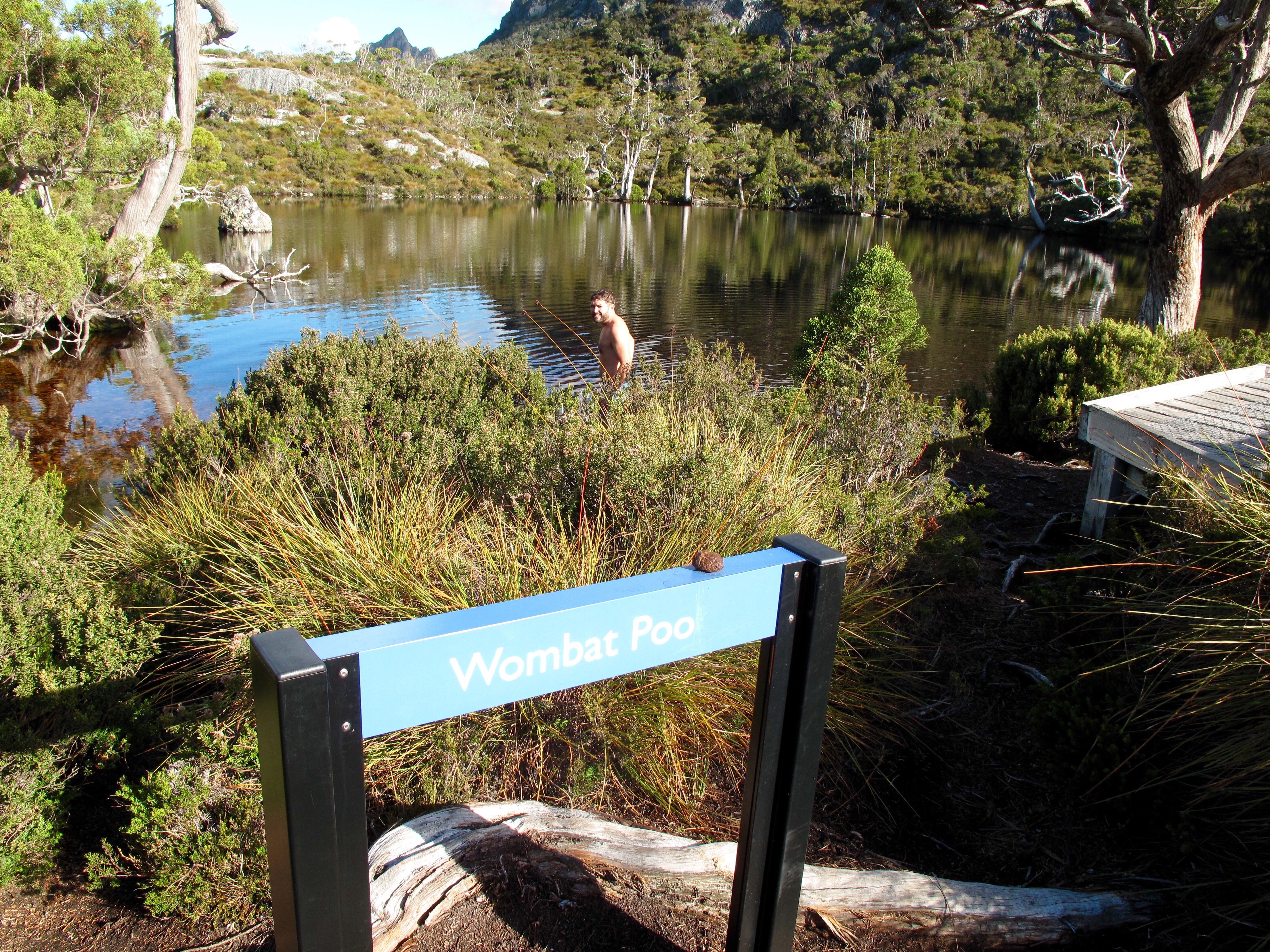 Anyhow, there was a loop we could take to finish the hike back at our car. We made a stop at Wombat Pool, where some rascal had removed the ‘L’. So, I took a swim in Wombat poo. It was a little murky but what do you expect? We really lucked out with weather – the past 4 days were overcast but our one summit day was clear with only a few staggered clouds. Afterwards we made our way east towards the coast.